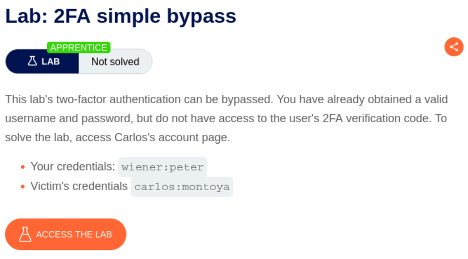 Two-factor authentication (2FA) serves as a critical security layer for protecting user accounts, but improper implementation can render this protection ineffective. This lab demonstrates a common vulnerability where applications fail to properly enforce 2FA verification, allowing attackers to bypass the authentication process entirely by manipulating navigation flow.
