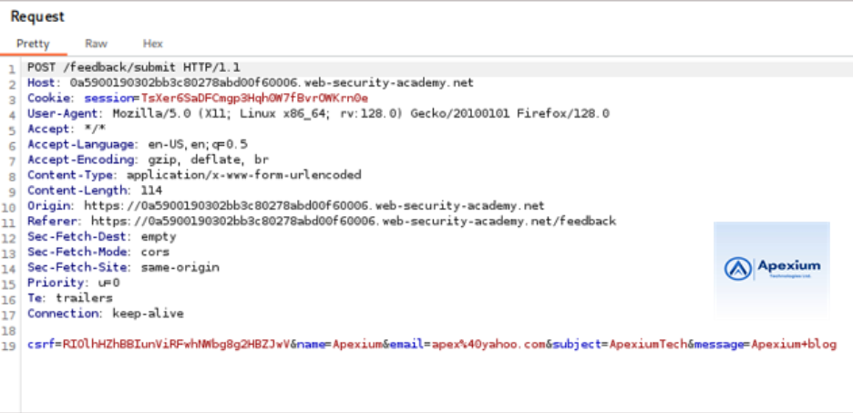 - Intercept the Feedback Submission Request: Open Burp Suite and turn on request interception. Submit the feedback form on the lab webpage to generate an HTTP request, which should appear in the Proxy tab.