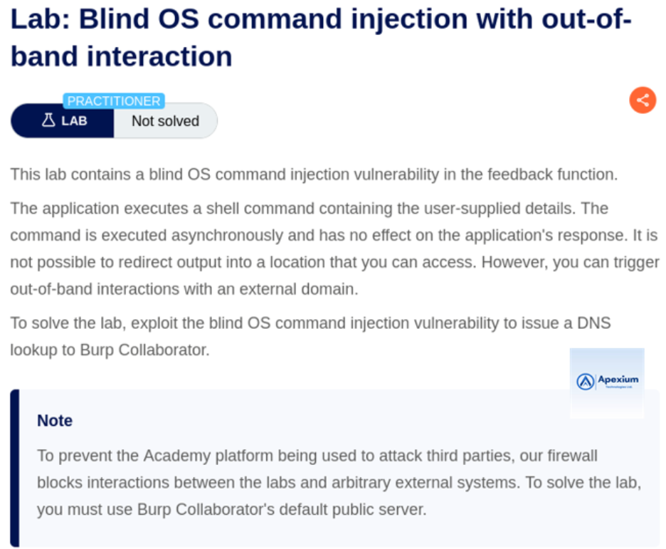The “Blind OS Command Injection with Out-of-Band Interaction” lab in the PortSwigger Web Security Academy exemplifies how attackers can detect and exploit command injection vulnerabilities even when the application provides no direct feedback. By leveraging external services, attackers can infer successful exploitation through out-of-band interactions like DNS or HTTP requests. This lab explores such techniques using Burp Suite’s Collaborator tool to detect and confirm asynchronous command execution.