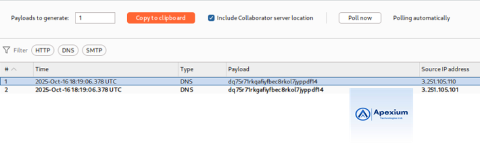 - Poll for Interactions: Return to the Collaborator tab and click “Poll now”. Wait a few seconds if needed and poll again to check for incoming DNS interactions.