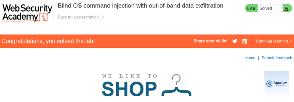 This lab highlights the stealth and potency of blind command injection, especially when combined with out-of-band techniques. Even without direct command output, attackers can extract sensitive data by leveraging asynchronous interactions. It underscores the need for rigorous input validation and secure design practices to prevent command execution vulnerabilities from becoming exploitable.