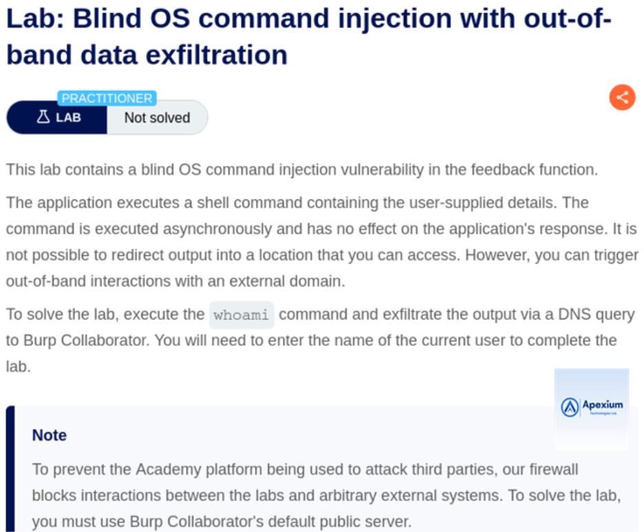 The Blind OS Command Injection with Out-of-Band Data Exfiltration lab from the PortSwigger Web Security Academy illustrates how an attacker can exploit command injection vulnerabilities to exfiltrate data indirectly. Unlike traditional command injection payloads that rely on immediate output, this technique uses DNS or HTTP interactions via Burp Suite Collaborator to capture the results of executed commands. This exercise demonstrates a powerful method for retrieving data from systems where direct feedback is not possible.