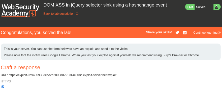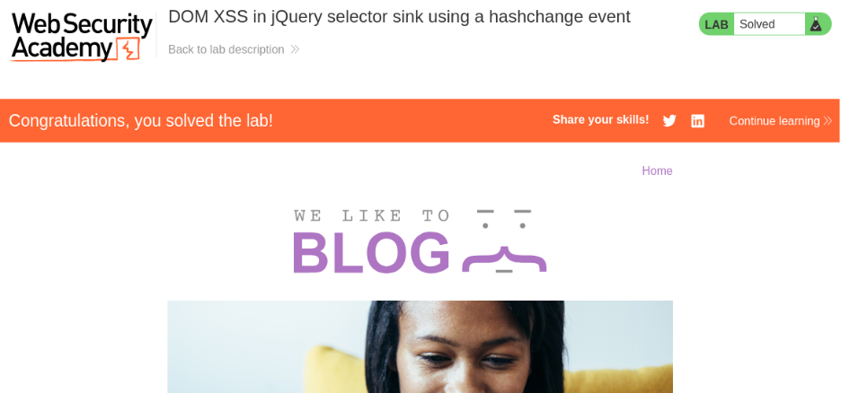 This lab demonstrates how unsafe handling of URL fragments in jQuery can lead to DOM XSS. Attackers exploit the `hashchange` event to inject malicious payloads, bypassing traditional server-side defenses.