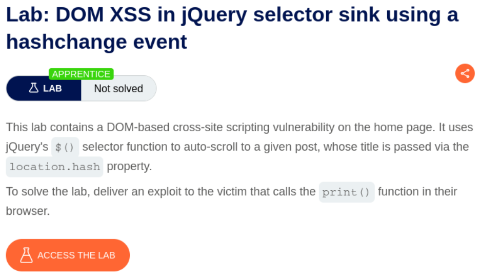 This lab demonstrates how unsafe handling of URL fragments in jQuery can lead to DOM XSS. Attackers exploit the `hashchange` event to inject malicious payloads, bypassing traditional server-side defenses.