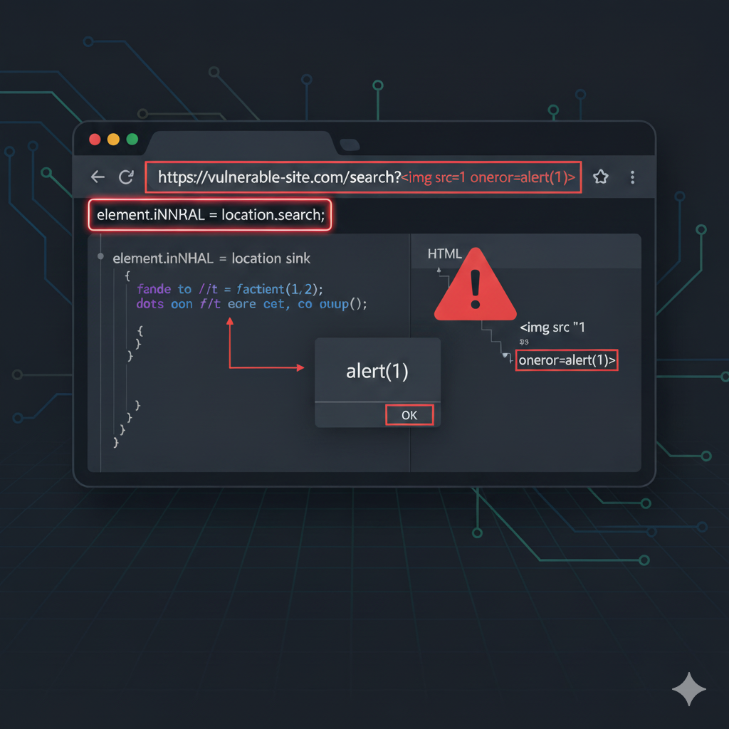 - The `innerHTML` property sinks the payload into the DOM, rendering the malicious `<img>` tag.