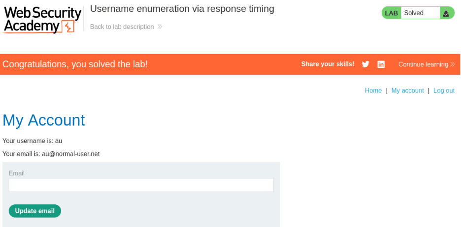 This lab demonstrates the sophisticated nature of timing-based enumeration attacks and their ability to bypass traditional security controls. The vulnerability highlights the importance of considering side-channel information leakage in security implementations. Organizations must recognize that preventing username enumeration requires attention to both content-based and timing-based information disclosure. Proper mitigation involves implementing consistent processing patterns, asynchronous authentication workflows, and comprehensive rate limiting that cannot be easily bypassed through simple header manipulation. As attackers continue to develop more sophisticated techniques, defenders must consider the full spectrum of potential information leakage channels in their security implementations.
