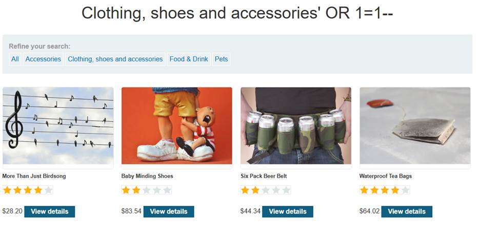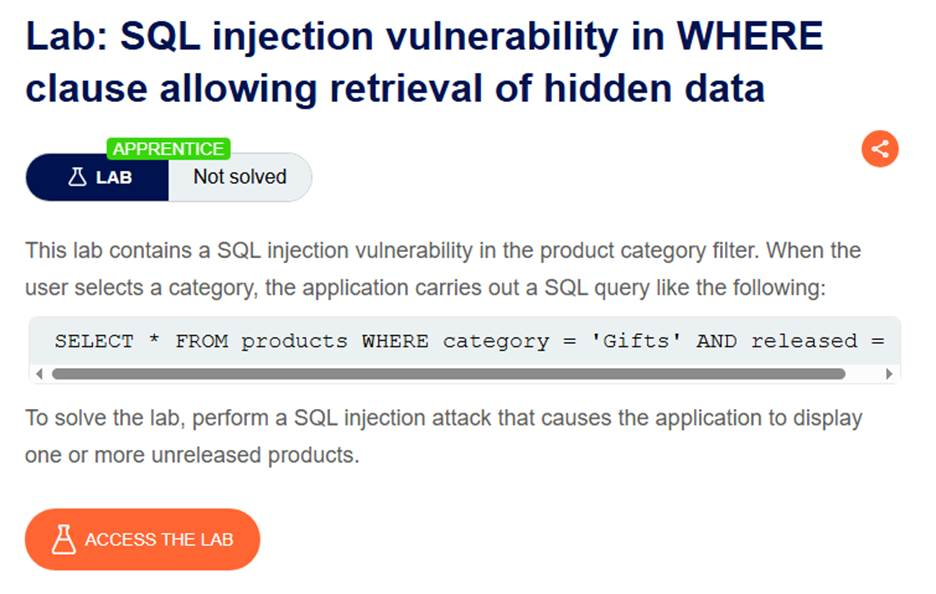 - The application uses a SQL query that looks something like this: SELECT * FROM products WHERE category = ‘Gifts’ AND released = 1. Your goal is to bypass the AND released = 1 condition.