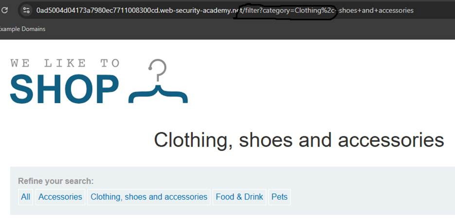 - In the URL or the HTTP request, you’ll see a parameter for the category, such as ?category=Clothing.