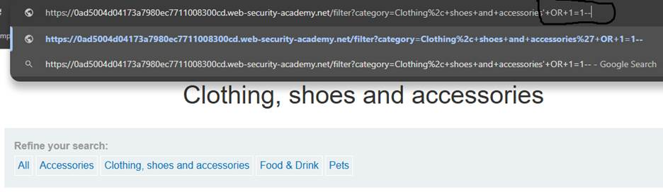 - Modify the category parameter by adding ‘+OR+1=1–. The single quote closes the original string, the OR 1=1 is a condition that is always true, and the double dash — comments out the rest of the original query, including the AND released = 1 part.